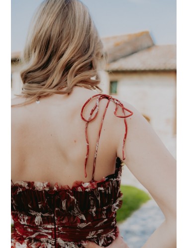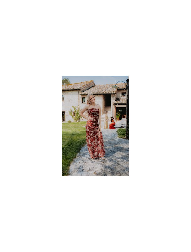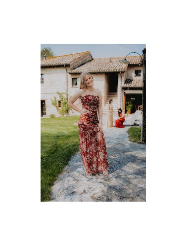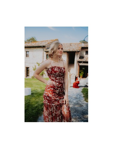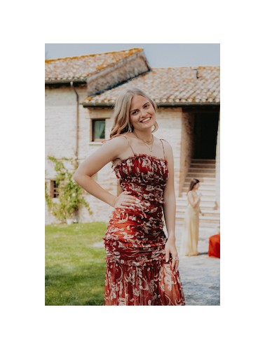 Abito lungo a balze con dettaglio pizzo in vita, scollo a V e bretellina fina.